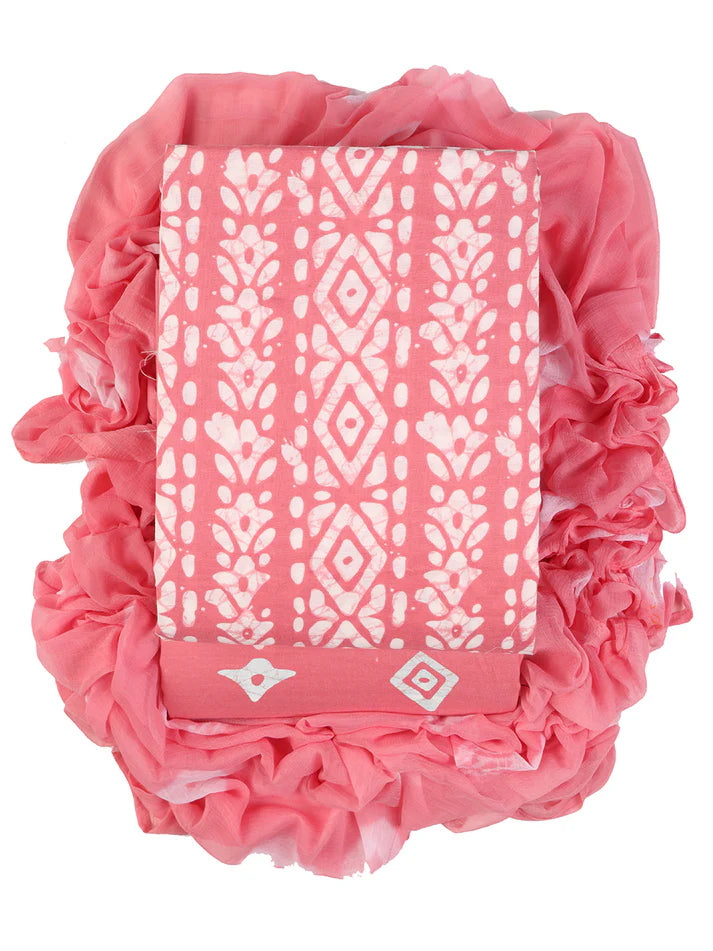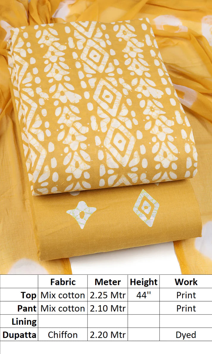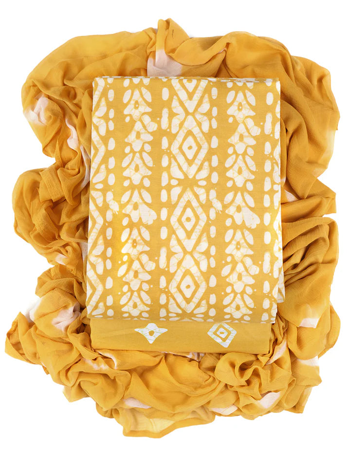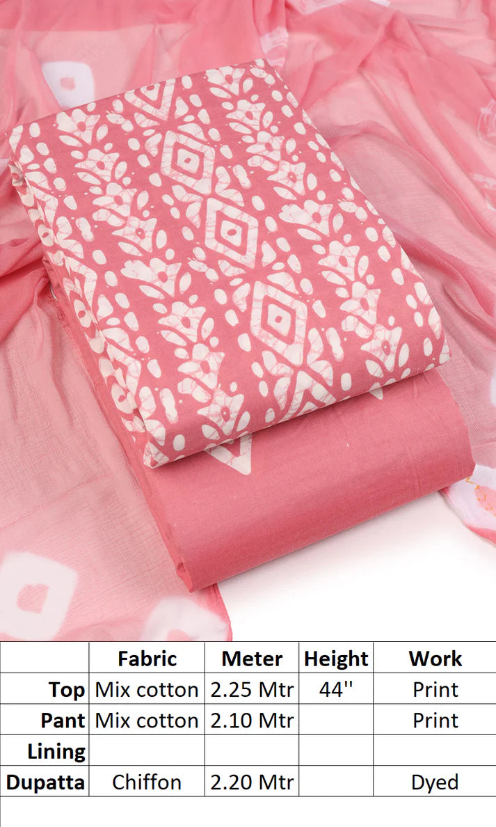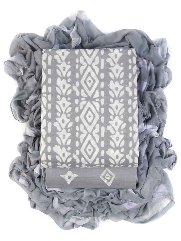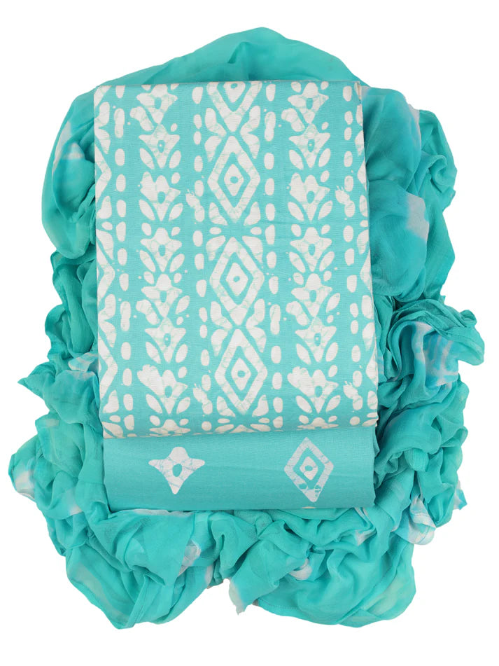 Elevate your ethnic wardrobe with this unstitched cotton blend dress material, designed with elegant batik prints and a soft chiffon dupatta. Perfect for tailoring into your own unique style.