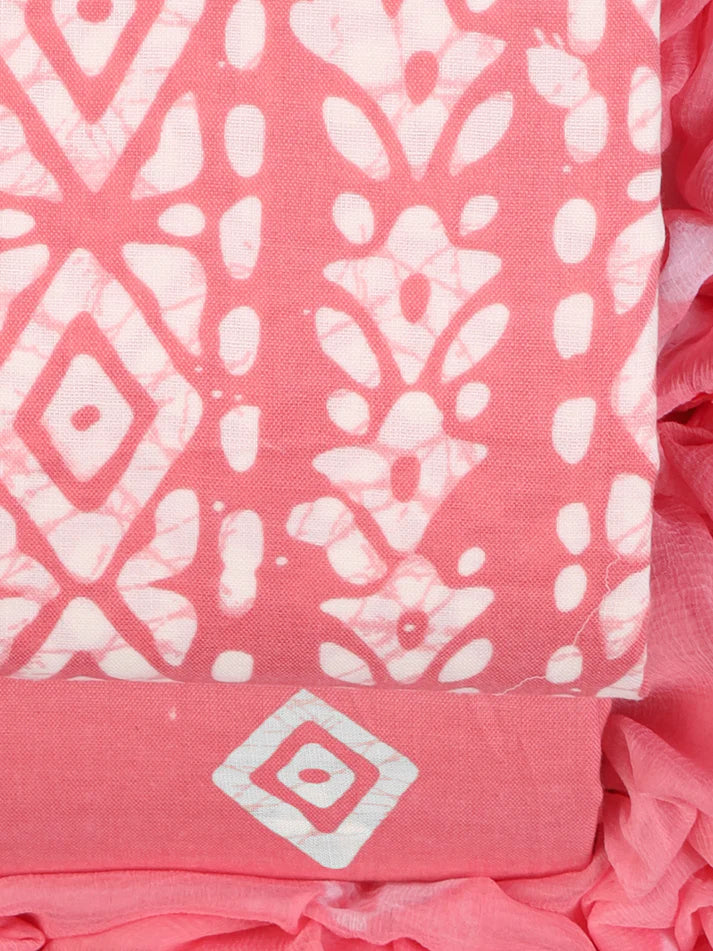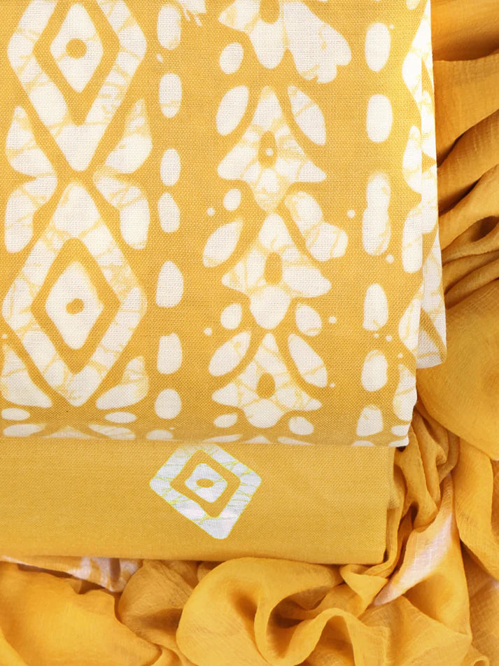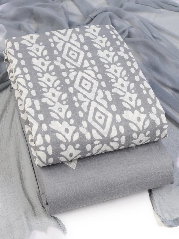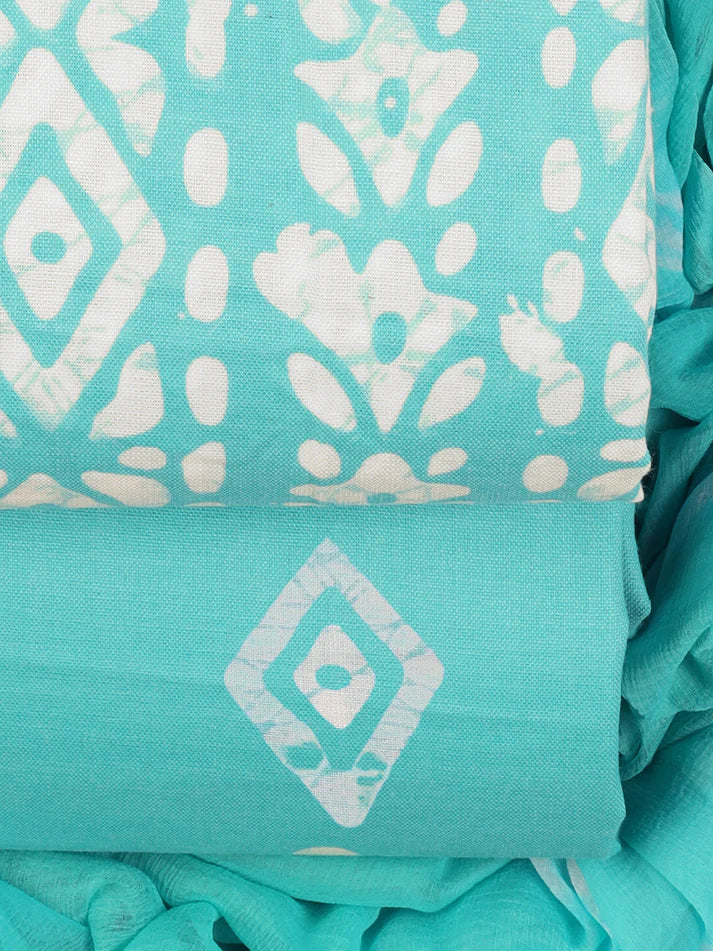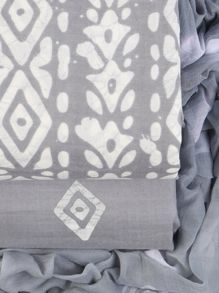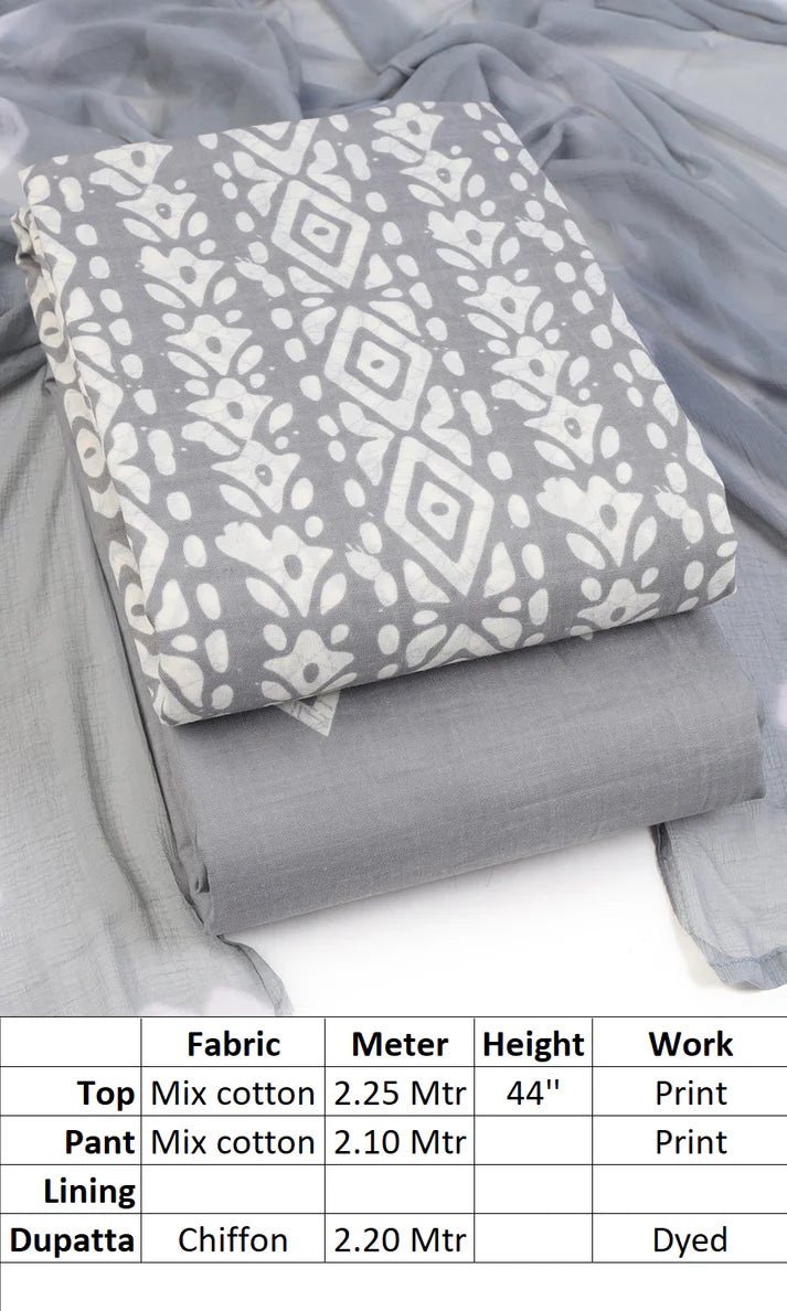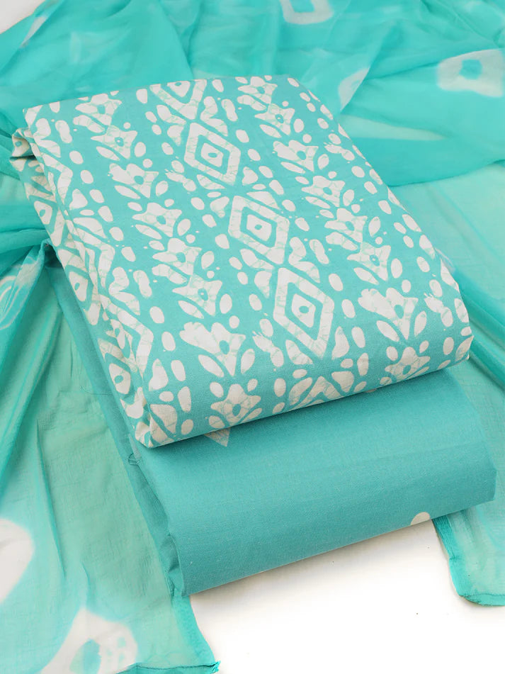 Elevate your ethnic wardrobe with this unstitched cotton blend dress material, designed with elegant batik prints and a soft chiffon dupatta. Perfect for tailoring into your own unique style.