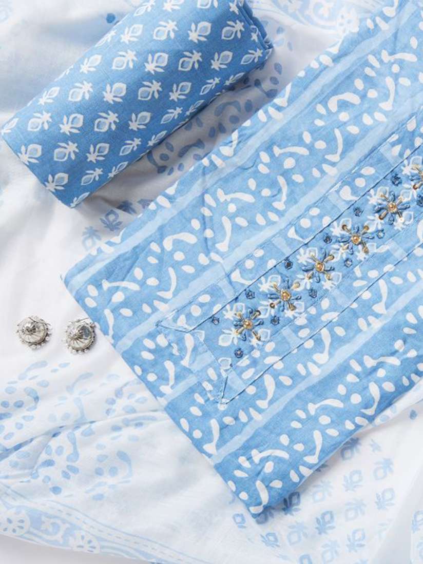 Elevate your ethnic style with the BlueAura Dress Material, featuring a soft cotton top, bottom, and dupatta in a soothing blue & white combo by The Elephant Big Store. Perfect for traditional wear, its breathable fabric ensures all-day comfort while the elegant neck work adds a touch of sophistication.