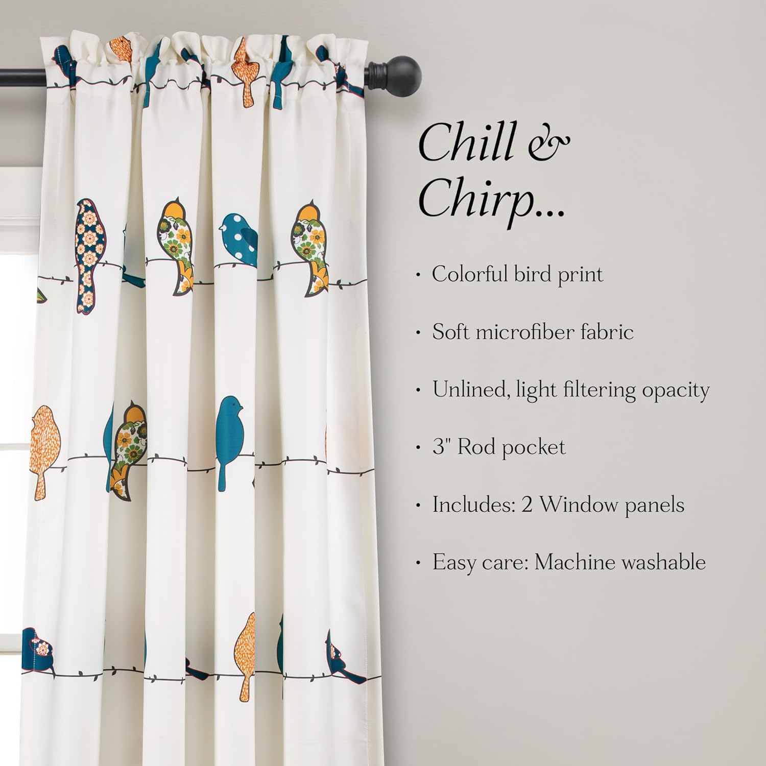 Celebrate your fun side with our The Elephant Big Store's Birds Light Filtering Window Curtain Panels. This eclectic print has rows of colorful birds perched on a wire. Each bird displays a whimsical floral pattern, adding playful charm to your decor. Adds a cheerful vibe to your space with this playful bird-printed door curtain. Made from semi-transparent polyester, it gently filters light while brightening up any room with its vibrant, whimsical design.