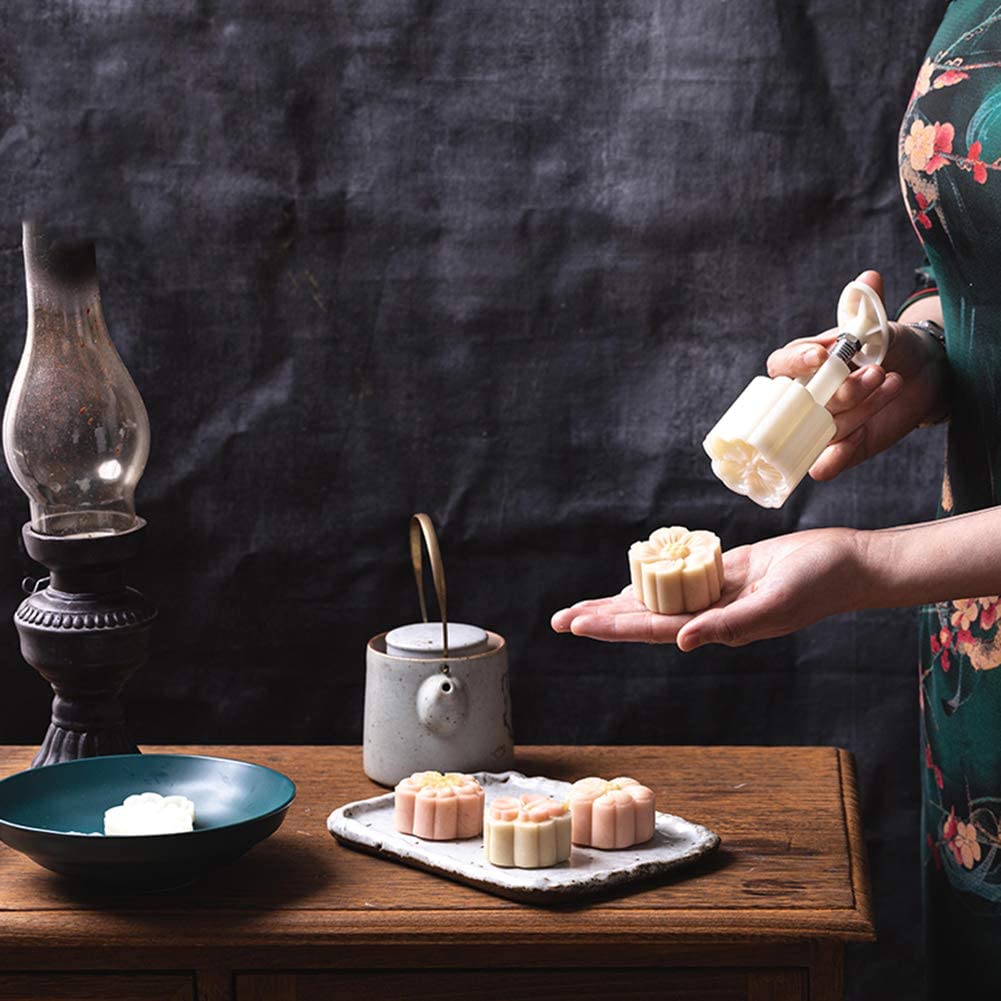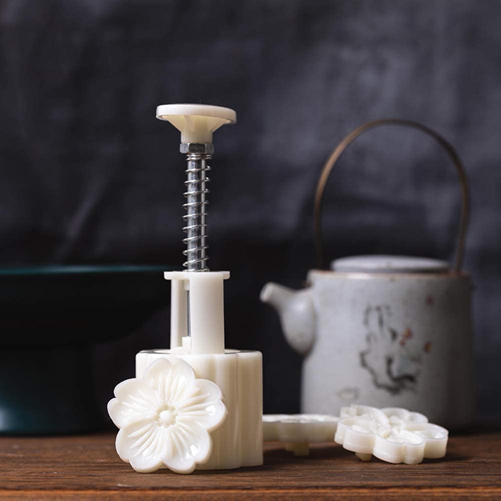 Create beautiful traditional treats with The Elephant Big Store's Mold Set. Includes 1 hand press mold and 4 interchangeable cherry blossom pattern stamps — ideal for mooncakes, cookies, bath bombs, and more.