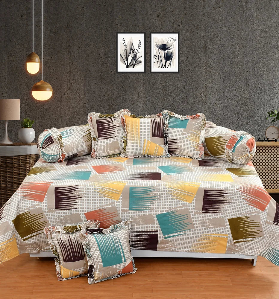 - Complete Set for a Full Makeover – includes 1 diwan bedsheet, 2 bolster covers & 5 cushion covers