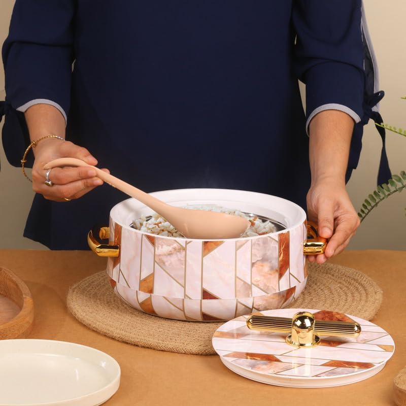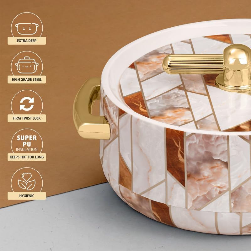 Keep meals hot and fresh with The Elephant Big Store's Elegance Royal Casserole Set. This stylish set of 3 insulated casseroles (1700ml, 1200ml, 600ml) features a durable steel interior, PU insulation, and airtight lids — perfect for chapati, biryani, curries, and more.