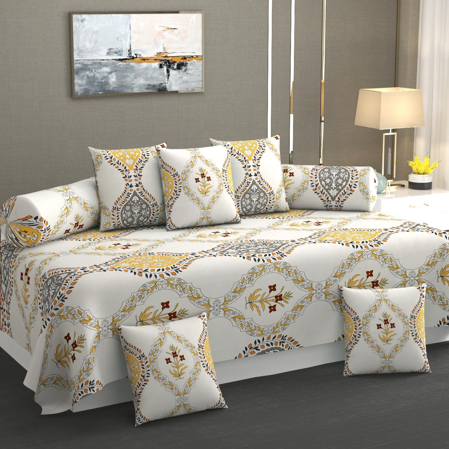 Includes: 1 Single Diwan Bedsheet (58" x 88"), 2 Bolster Covers, 5 Cushion Covers