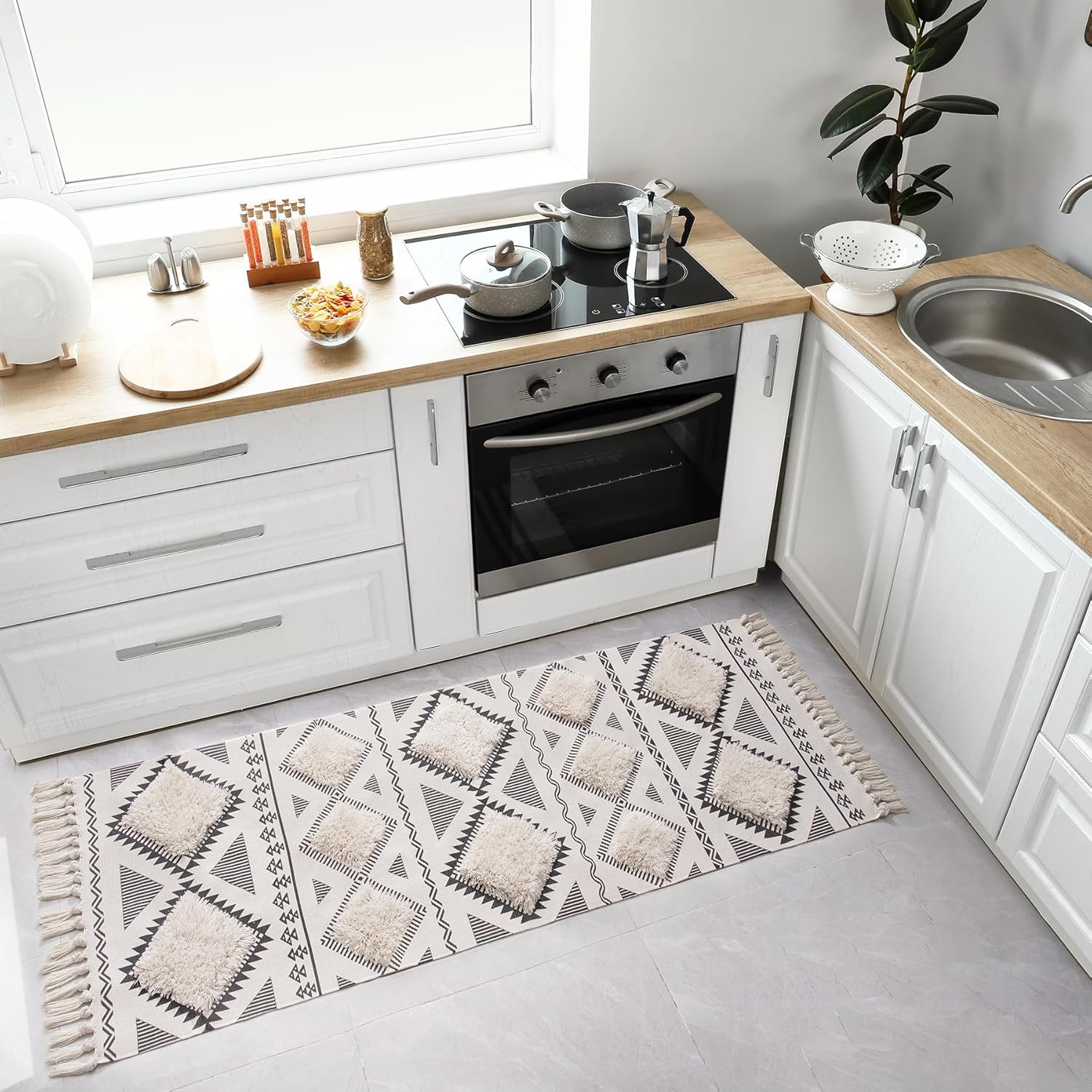 Hand Woven Tufted 100% Natural Cotton Bedside Runner with Tassels (2x5 feet)