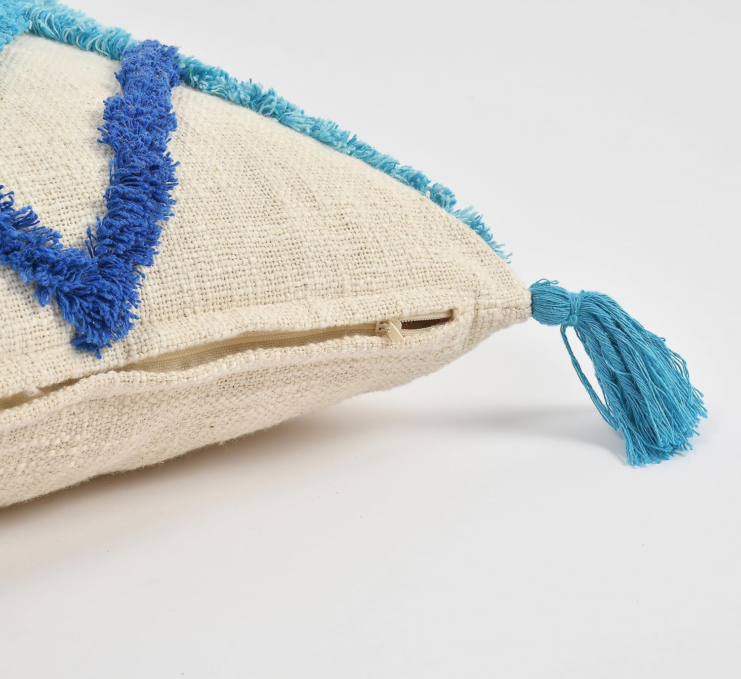 Elevate your decor with these soft tufted cotton cushion covers featuring elegant tassels and a self-design in a stylish blue and beige diamond design from The Elephant Big Store. Perfect for living rooms, bedrooms, patios, and more.